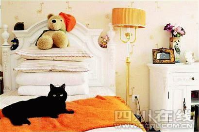 粉紅壁紙、成套白色歐式單人床、床頭柜、落地燈……床頭一張大頭照中的黑色貓咪,是這間屋的主人。貓主人專門將一間閑置的客臥打掃出來,用作“女兒”的“閨房”。被子枕頭用不上,但是一兩條名牌的毛毯是必備的。床上的玩具是貓主人去香港迪斯尼玩時帶回來的駝色小烏龜。