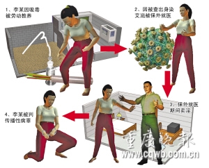 據(jù)永川區(qū)法院介紹,該區(qū)下崗中年婦女李某原是一名吸毒女子,因吸毒被勞動(dòng)教養(yǎng)。進(jìn)勞教所時(shí),抽血化驗(yàn)查出李的血液中攜帶艾滋病毒。勞教場(chǎng)所為此對(duì)李采取了保外就醫(yī)措施。