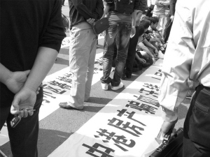 昨天早上8點,100多名浙江中港業(yè)主自發(fā)地拉著橫幅來到金華市政府門口申訴。