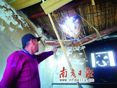 丁學(xué)聰老漢指著被砸穿的屋頂,仍然心有余悸。