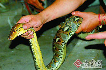 截至昨晚記者發(fā)稿時(shí),相關(guān)部門作出鑒定:被捕獲的蟒蛇為國(guó)家一級(jí)保護(hù)動(dòng)物金花大蟒。但從其花色和身體上鮮艷的色彩來看,目前國(guó)內(nèi)還沒有類似花色的蟒蛇出現(xiàn)。(記者 戴振華 攝影報(bào)道)