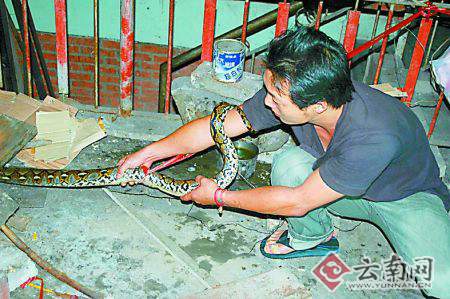 前日凌晨5點(diǎn),接到景洪市畫家楊洪榮的熱線電話,記者從睡夢(mèng)中躍起,驅(qū)車趕到位于版納氣象局住宿區(qū)內(nèi)的一間民宅。只見其二樓陽(yáng)臺(tái)上燈火通明,7名男女的身影正在樓上緊張地晃來晃去,原來,楊洪榮的家中發(fā)現(xiàn)了一條手臂粗的蟒蛇,幾人正在與蟒蛇進(jìn)行著激烈的搏斗。