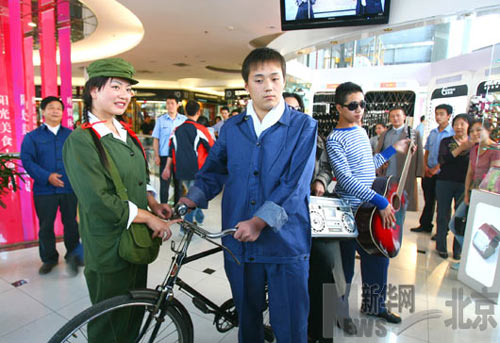 其中,一個(gè)代表上世紀(jì)70年代工人形象的男士身穿一身藍(lán)色工作服,推著一輛老式“永久牌”自行車,展示著當(dāng)年的“流行風(fēng)尚”;一個(gè)小伙子身穿;晟、戴著蛤蟆鏡,手彈吉他,邊走邊唱,這是上世紀(jì)80年代時(shí)尚潮流青年的形象再現(xiàn)。