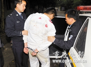 至昨下午4時(shí)許,南岸警方結(jié)束對被抓獲男子的突審,移交南川警方。男子身穿一套白色運(yùn)動(dòng)服,脖戴1條很粗的金項(xiàng)鏈。(首席記者 黃艷春/文 記者 冉文/攝 郭娟/制圖)