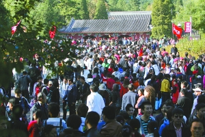 昨日,香山公園東門外擠滿了等候進(jìn)園的游客。當(dāng)日,香山游客達(dá)到8萬(wàn)人。