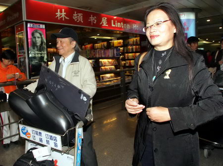 吳介琴與新婚妻子走出機(jī)場(chǎng)大廳