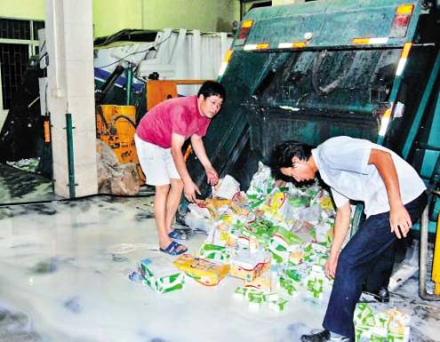 高先生說,國家規(guī)定對(duì)9月14日前出場(chǎng)的不合格乳制品進(jìn)行銷毀處理,但并沒有規(guī)定具體銷毀方法。他們選擇將液態(tài)奶送垃圾站處理,是因?yàn)樗麄冋J(rèn)為這是一種比較正規(guī)的銷毀方式。而在小城市,一般只是將成箱液態(tài)奶集中后碾壓,然后掩埋。