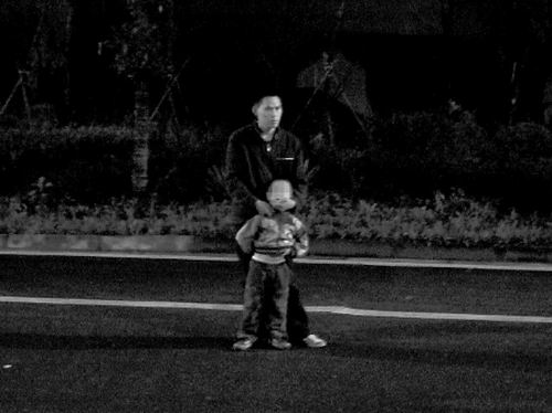 一名中等身材、瘦削的男子站在公平街辦建安社區(qū)5組路口對面的龍新路快車道上,身前緊挨著站著一名小男孩。據(jù)稱,小男孩就是持刀男子的親生兒子、5歲的小明(化名)。男子右手緊握一把20多厘米長的尖刀,刀刃緊貼著小明的脖子,不時(shí)在快車道上來回走動(dòng),還左右張望,十分警惕。一名戴眼鏡男子站在持刀男子對面三四米外,正在與當(dāng)?shù)嘏沙鏊窬嗫谄判牡貏裾f男子放開劫持的小男孩。戴眼鏡男子是持刀男子的大哥。