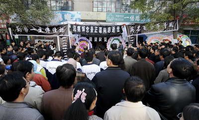 11月10日上午9時許,記者在榆中縣一悟路111號景正翠老師的家門口看到,搭起的靈棚兩側(cè),掛著“勤勞一生傳佳話”、“沉痛悼念景正翠老師”的橫幅,數(shù)百只花圈安放在景正翠老師遺體前,上千名老師、學(xué)生站在遺體兩側(cè)默哀。