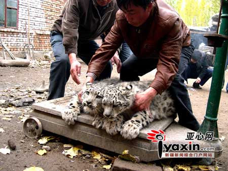伊寧縣喀拉亞尕奇村牧民張培偉,今年5月10日,在山區(qū)放牧?xí)r撿回一對酷似草原斑貓的兩只小動物,并把這對“草原斑貓”帶回家,當(dāng)成寵物飼養(yǎng),沒想到這兩只“斑貓”越長越像豹子。后經(jīng)專家認(rèn)定是國家一級保護(hù)動物——雪豹。如今這一雄一雌雪豹體重已達(dá)15公斤,每天需4-5公斤鮮肉喂養(yǎng),救助者張培偉已難承擔(dān)雪豹的“伙食”供應(yīng)。但是雪豹作為國家保護(hù)的珍稀野生動物,既不能出售,又不宜放歸自然,加之在本地也沒有合適的救護(hù)地,只能由他繼續(xù)養(yǎng)護(hù)著,如今,越養(yǎng)越大的雪豹如一個燙手的山芋,讓張培偉陷入進(jìn)退兩難的境地。