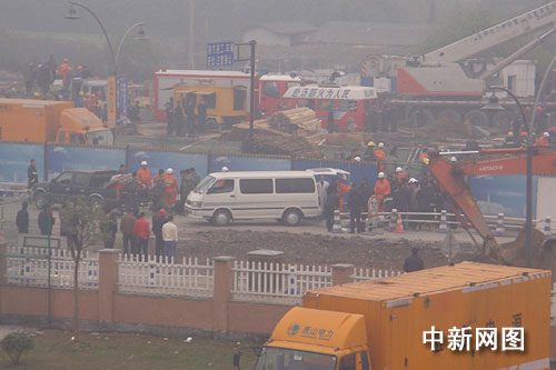 中新網(wǎng)杭州11月16日電(記者 龔讀法 實(shí)習(xí)生 王磊 姜越潮)2008年11月16日上午9時(shí)15分,浙江省杭州市蕭山區(qū)地鐵坍塌現(xiàn)場(chǎng),駛進(jìn)一量殯葬專(zhuān)用車(chē),救援工作有序展開(kāi)。16日上午11時(shí)將召開(kāi)最新救援工作新聞發(fā)布會(huì),通報(bào)最新救援情況,并將在16日下午公布下一步救援方案。