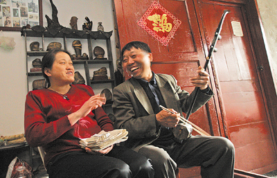 昨日,北碚區(qū),董德利為妻子劉云芳拉二胡 記者 鐘志兵 攝