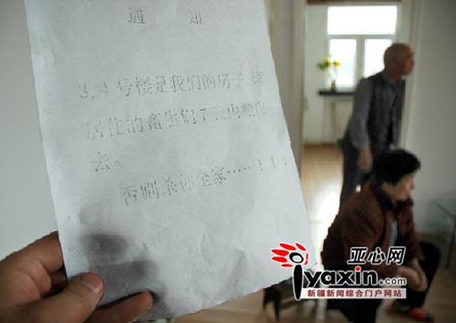 造成這一現(xiàn)象的原因是由于十天前,此小區(qū)里突然張貼了十幾張通知,內(nèi)容很恐怖:如果三、四號(hào)樓的住戶不搬家,就殺他全家。!昨日此新聞在亞心網(wǎng)上發(fā)布之后,立即被全國(guó)各大網(wǎng)站轉(zhuǎn)載,影響力非常之大,網(wǎng)民的反應(yīng)也相當(dāng)強(qiáng)烈;趶(qiáng)大的社會(huì)輿論壓力,前期一直不肯露面的星云房產(chǎn)公司接受了亞心網(wǎng)記者的采訪。