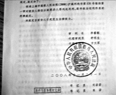 她稱,7點(diǎn)左右,來了兩個(gè)上海高級(jí)人民法院的法官,向她送達(dá)了最高法的刑事裁定書。該文的簽發(fā)日期是11月21日。文中核準(zhǔn)了上海市高級(jí)人民法院的二審判決。