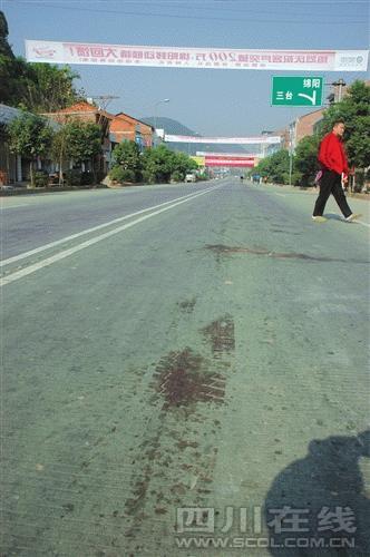 出事地點(diǎn)位于鹽亭縣兩河場(chǎng)鎮(zhèn)中部一個(gè)路口,是小鎮(zhèn)相對(duì)熱鬧的地段,周圍店鋪也較為集中。盡管過(guò)去了10多個(gè)小時(shí),路面上一攤凝固的血跡和往來(lái)車輛碾壓血跡形成的暗紅色輪胎印跡仍清晰可見(jiàn)。