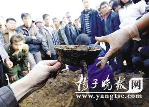 記者聞?dòng)嵹s到現(xiàn)場時(shí),古墓旁邊已圍了二三十人,在人群中央,兩名婦女各拿著一把鐵鍬,站在一青磚砌的大坑里,挖出的長方形青磚堆在一邊,旁邊還有4個(gè)青瓷罐,其中一個(gè)有臉盆大小。如此完整的青瓷罐,光滑如新,吸引了許多人觀看、撫摸,其中一名圍觀者還打開青瓷罐邊上的一個(gè)黑塑料袋,發(fā)現(xiàn)里面竟有剛挖出來的兩個(gè)青銅器,其中一個(gè)青銅器已被損壞,成了幾片。