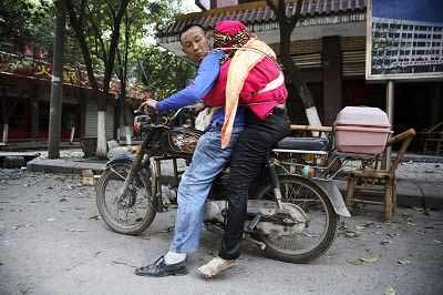 吳家芳把妻子的手環(huán)繞著綁在自己的腰上,臉緊貼著自己的背,這個姿勢一如從前。他發(fā)動摩托車,背著妻子回家。