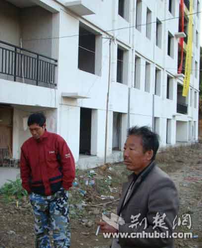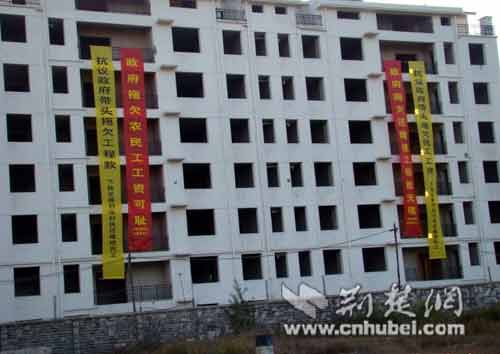 還建樓上懸掛標語稱“政府拖欠農(nóng)民工工資”