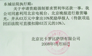 去年9月,賈利華被判返還北京比卡羅比薩餅有限公司借款63萬(wàn)元。案件執(zhí)行時(shí),法院經(jīng)合法傳喚,賈利華本人拒不到庭,只委托朋友來(lái)院了解案件。目前賈利華下落不明,法院依法對(duì)賈利華實(shí)施邊控限制其出境。北京比卡羅比薩餅有限公司現(xiàn)書(shū)面申請(qǐng)懸賞曝光,懸賞金為63萬(wàn)元的10%。