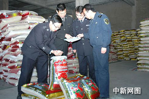 喀什海關(guān)查驗和緝私關(guān)、警員對查獲的走私出口大米進行核對。(孫濤 攝)