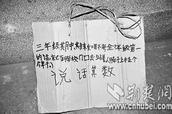 在桌子上,記者看到一塊黃色紙牌,上面寫著:“三年級(jí)期中、期末如果不考全年級(jí)第一的話,就到學(xué)校門口去站著!(如圖)。