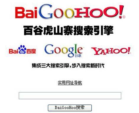 日前,一款名為“百谷虎”的搜索引擎引起了不少網(wǎng)友的關(guān)注,這個(gè)搜索引擎一眼看去和普通搜索引擎區(qū)別不大,但仔細(xì)一看,百度、谷歌、雅虎這三大搜索引擎的LOGO被整合成了“baigoohoo”,搜素框的上方還有該引擎的廣告語“集成三大搜索引擎,步入搜索新時(shí)代”。 (11月20日《信息時(shí)報(bào)》)