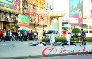 據(jù)目擊者講,當(dāng)該男子從100多米高空跳下時,一老漢卻騎著自行車闖進(jìn)了警戒區(qū),正好被砸中,頭重重地摔在了旁邊花壇的石階上,血流不止。而跳樓的男子也當(dāng)場氣絕身亡。隨后,120急救人員馬上將被砸中的男子送往醫(yī)院急救。昨晚6時50分許,記者趕到常平醫(yī)院重癥病房時,被砸中的老人已宣布不治身亡。