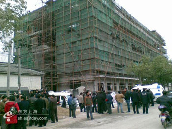 位于奉賢區(qū)金匯鎮(zhèn)金錢(qián)公路2225號(hào)的一在建6層樓房坍塌,8名工人被埋。(圖片來(lái)源:東方網(wǎng))