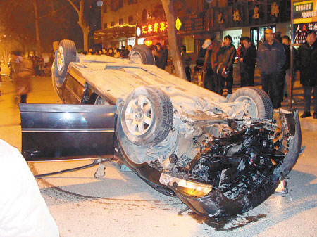 昨天晚上9點(diǎn)40分左右,渭南市建設(shè)局一位副局長的小轎車在東風(fēng)大街逆行百余米,從綠化帶越過并撞倒10多米高的路燈桿后四輪朝天。事故造成人行道上一位騎自行車帶著4歲孩子的母親死亡,孩子受傷被送醫(yī)院治療。 記者 石俊榮 攝