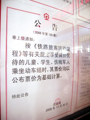 昨天下午,記者來到北京站售票大廳,在大廳的公告欄上看到,一張編號為“2008年第189期”的公告上稱,奉上級通知,按《鐵路旅客運(yùn)輸規(guī)程》等有關(guān)規(guī)定享受減價優(yōu)待的兒童、學(xué)生、傷殘軍人乘坐動車組時,其票價均以公布票價為基礎(chǔ)計算。