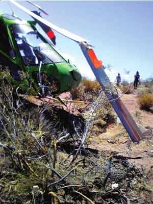 在第4賽段,央視的直升機(jī)對(duì)盧寧軍的賽車(chē)進(jìn)行跟蹤航拍,結(jié)果直升機(jī)在30米高空中突然出現(xiàn)故障,飛機(jī)呈自由落體墜地,當(dāng)時(shí)工作人員迅速上前解救,幫助航拍的記者逃離了飛機(jī)。飛機(jī)墜地后,后翼和螺旋槳都已經(jīng)損壞,萬(wàn)幸的是沒(méi)有人員傷亡。