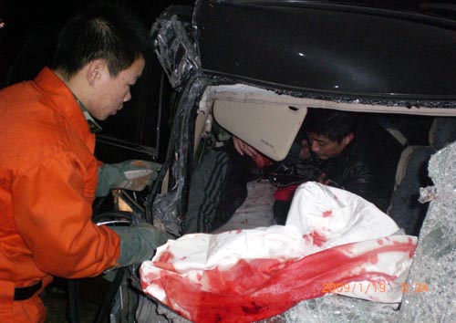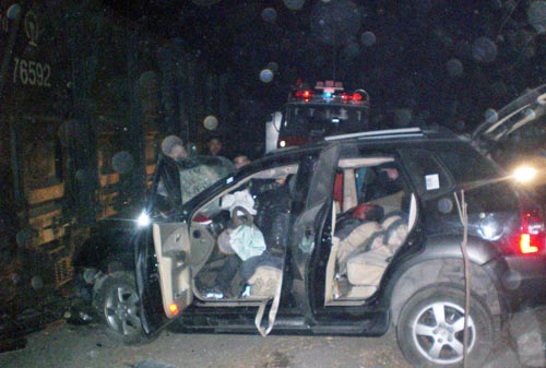 凌晨3時14分,接到報警后,漯河源匯區(qū)消防大隊特勤中隊中隊長彭中明立刻帶領(lǐng)一部搶險救援車10余名隊員火速趕往事故現(xiàn)場。距離現(xiàn)場50米外,就能看到一列長長的火車停在南環(huán)路中間,把進(jìn)入漯河市區(qū)內(nèi)的幾條主要通道牢牢堵死,造成進(jìn)出漯河的幾輛汽車無法通行。來到事故現(xiàn)場,只見一輛小轎車的車頭被撞得面目全非,擋風(fēng)玻璃被撞碎,車前的引擎蓋被撞得凸了出來,一名40多歲的司機(jī)滿臉是血,嘴里不停地發(fā)出微弱的呻吟聲。由于他的雙腳被卡在變形的車體內(nèi),現(xiàn)場的交警經(jīng)過多次努力最終沒能將其救出。