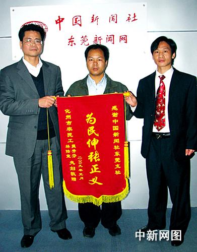 中新網(wǎng)東莞1月20日電(記者 李映民)在廣東省東莞市務(wù)工的農(nóng)民工林陸宣和莫秀芬夫婦今天給中國新聞社東莞支社送來了一面錦旗,以表達他們拿到被拖欠近兩年工資的喜悅心情。