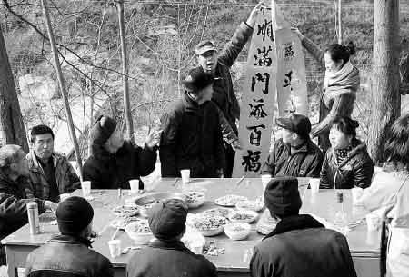 這一桌豐盛的酒菜,是常年在長安區(qū)大峪口龍石溝利用業(yè)余時(shí)間義務(wù)植樹造林的郭建民一家精心準(zhǔn)備的,專門宴請(qǐng)龍石溝的15戶村民一同提前吃年夜飯。