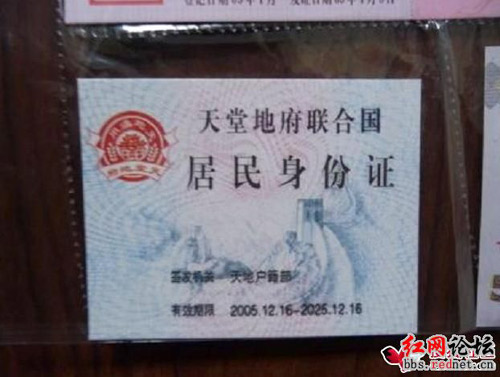 最“雷人”的是冥幣上印制的內(nèi)容!其中“天堂地府聯(lián)合國(guó)居民身份證”,發(fā)證機(jī)關(guān)是天地戶籍部,最有“創(chuàng)意”的要屬其“國(guó)徽”了,上面印有國(guó)名“天堂地府”,還有“天地通用”四個(gè)字樣。而神通廣大的“天地通用”的紙幣,發(fā)行銀行是“天地銀行有限公司”,上面的圖案是傳說(shuō)中的玉皇大帝。