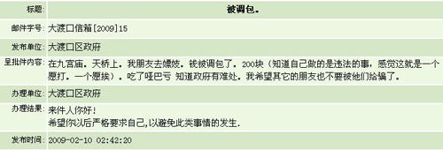 這封來信反映:在大渡口九宮廟天橋上,“我朋友去嫖妓錢被調(diào)包了,損失200塊。”來信的目的是:希望政府打擊賣淫行為,以讓“其他的人不要被他們給騙了。”辦理該來信的大渡口區(qū)政府回信只有一句話:“希望你以后嚴(yán)格要求自己,以避免此類事情的發(fā)生!
