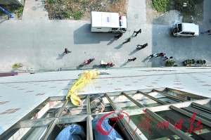 記者在案發(fā)地點(diǎn)南海鹽步霍邊新村一巷1號樓314房(實(shí)際為四樓),該房的一扇窗戶靠著旁邊的一條馬路。在一家小型商店的門前一攤血跡,而在樓頂則掛著一條用被單和鞋帶組成的繩子,隨風(fēng)搖擺。