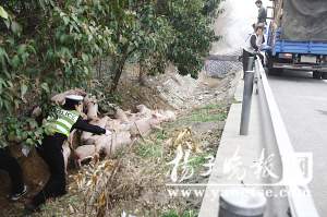 原來,當(dāng)日一輛懸掛湖北牌照的倉柵式貨車運(yùn)了300頭小豬,經(jīng)寧合高速公路由江蘇灌云開往湖北黃石。在途經(jīng)南京浦口侯莊跨線橋路段時(shí),該車右后輪突然發(fā)生爆胎,車輛側(cè)翻在路上,裝豬的籠子遭路邊護(hù)欄撞擊全部破了。受驚的小豬崽們趁機(jī)“越獄”,在高速公路上狂奔。
