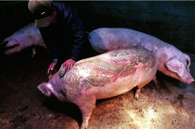 記者看到,還有9頭文身豬在寬敞明亮的豬圈中,而原來(lái)一起長(zhǎng)大的3個(gè)同伴都準(zhǔn)備前往歐洲,并被賣出了70萬(wàn)到100萬(wàn)元人民幣的高價(jià)。9頭豬都是母豬,剛滿周歲。“因?yàn)槟肛i更耐痛,文身更方便!憋曫B(yǎng)員潘師傅說(shuō)。見到生人進(jìn)到豬圈,豬開始不安分地嗷嗷叫。這幾頭豬的體重都在400斤以上,長(zhǎng)得極為肥碩。它們身上都文有精美的圖案!斑@頭文著龍紋標(biāo)志的豬就叫大龍,文著美人魚的就叫美人魚,它們的名字都是根據(jù)花紋取名的!逼渌i身上文著宗教畫、中國(guó)年畫和卡通圖。