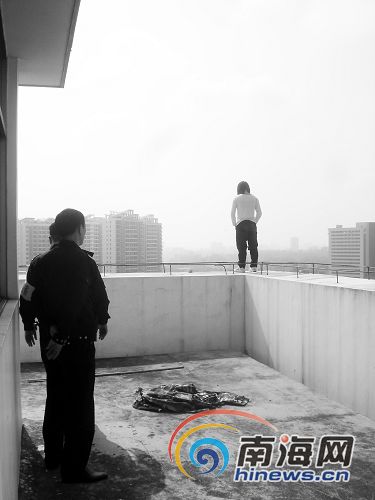 2月5日,阿春聽(tīng)從記者的勸說(shuō),當(dāng)天就從海口返回臨高的家里。結(jié)果,家人與阿春大吵了起來(lái)。阿春在家里呆不住,于2月6日中午從臨高趕到?冢S即來(lái)到?谀仙陈芬粭澊髽堑臉琼,站在樓頂?shù)倪吘墱?zhǔn)備跳樓自殺。