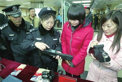 在昨天的展覽上,被查獲的違禁品裝滿20個展柜,警方在王府井站一層站廳中心用實物展柜和圖片圍成一個參觀區(qū),乘客在進(jìn)入站臺前便可以免費參觀。