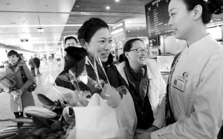 “四川汶川地震女英雄蔣敏來沈陽啦!”2月22日一早,記者聞?dòng)嵹s至沈陽桃仙機(jī)場。來自沈陽大健康體檢中心的醫(yī)護(hù)人員手捧鮮花,專程迎接這名堅(jiān)強(qiáng)的女警花。