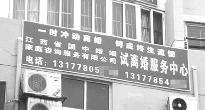 “一時沖動離婚,鑄成終生遺憾!苯,江西省南昌市北京東路京城大廈外墻懸掛的一塊大型廣告牌,吸引了過往市民的注意。做廣告的不是婚姻調(diào)解機構(gòu),而是一家“試離婚”服務(wù)中心。