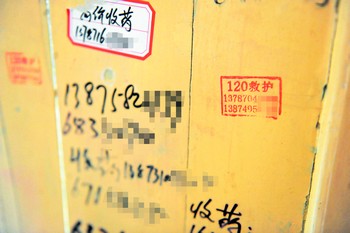 記者還在該院男、女廁所的門板、瓷磚、水管等處看到遍布的“救護(hù)車接送病人”、“出院用車”、“包車”、“病人接送車”、“120救護(hù)”等不同字樣的廣告標(biāo)貼,上面的所有電話都是私人手機(jī)號(hào)碼,個(gè)別廣告標(biāo)貼上甚至還配上了車輛圖片,顯得“很真實(shí)”。