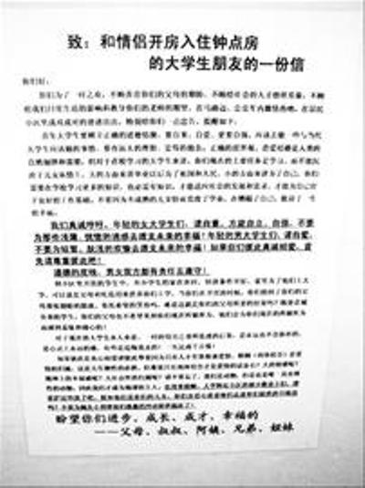 原公開信就貼在南京仙林大學城文苑路某高檔小區(qū)門口,信中告誡大學生不要“為了一時之歡,不顧養(yǎng)你們的親人的期盼,不顧給社會人才的榜樣形象,不顧給我們日常生活的影響,在居民小區(qū)內成雙成對地進出……”公開信還提醒提供日租房的小區(qū)業(yè)主“不要為蠅頭小利替他們愚蠢的沖動提供溫床了!”信件的落款是“盼望你們進步、成長、成才、幸福的父母、叔叔、阿姨、兄弟、姐妹!