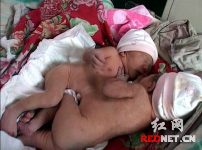 據(jù)悉,這對連體嬰兒的母親是新化縣石沖口鎮(zhèn)紅寨村28歲的段曉艷,在懷孕期間并未感到異常,5個月、8個月做B超顯示都為雙胞胎。3月16日8時許,她在新化縣中醫(yī)院婦產(chǎn)科經(jīng)過一個小時的剖腹產(chǎn)手術(shù),分娩出一對連體女嬰。兩女嬰從腹部粘連在一起,出生時兩女嬰共一根臍帶。目前,母、嬰身體狀況良好。