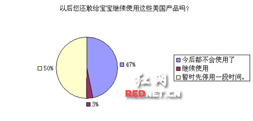 對于今后是否還會使用強(qiáng)生、幫寶適等產(chǎn)品,近47%的網(wǎng)友表示“以后都不會使用了,寶寶的生命要緊”,近50%的網(wǎng)友表示“持觀望態(tài)度,暫時停用一段時間”,兩者總和高達(dá)97%。僅剩下3%的網(wǎng)友明確表示,將繼續(xù)使用這些品牌的產(chǎn)品。(董雷)