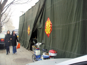 記者11時趕到分鐘寺東南角,看到在三環(huán)輔路行人道上,一個大棚支在一排修車店前。幾根金屬架子,幾塊大的深綠色厚被子搭成了這個棚子(左圖)。棚子的門口兩個大紅喜字貼在布上,棚內左側已經支起五個折疊桌,有兩位賓客已經落座,右側一個大鍋正燒著旺火,并排的兩個桌子上放著雞和蔬菜,三五個人正在切肉切菜準備一會兒做飯用。