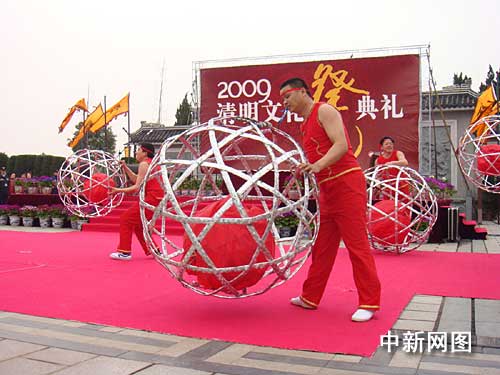 震撼的鐘鼓聲,以象征中華民族傳統(tǒng)中最高禮數(shù)的數(shù)字拉開文化祭祀的序幕;清婉的樂聲中,配以渾厚的嗓音朗誦祭文,表演滾燈的八名小伙則身著紅色演出服手持近一人高的滾燈登場(chǎng)。最令人意外的是,紅色成為這場(chǎng)祭祀的主打色彩——紅毯、紅漆大鼓、紅色的滾燈,表演者的頸上也都戴著一條絳紅色的圍巾,現(xiàn)場(chǎng)形成了一股中國民俗濃烈的傳統(tǒng)文化氣氛。