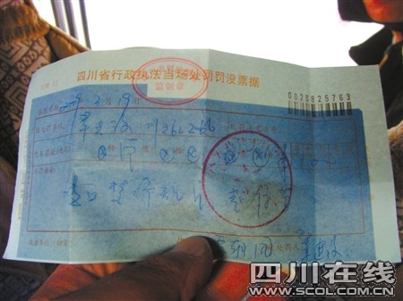 19日上午10時(shí)許,仁壽縣城區(qū)書院街,倪師傅正騎著新買的三輪車。一輛沒有牌照的長安之星警車,突然停在他面前,從車上下來兩個(gè)身著交警協(xié)警員制服的男子:“你的車不能進(jìn)城,過來接受處理!蹦邘煾到忉屨f:“警官,我是來給車上牌照的,交警大隊(duì)在城里,我必須進(jìn)城啊!薄吧僬f這些,違反了規(guī)定就要罰款。本來罰200元,念你是初犯,交100元就是了!彪S即,坐在該車駕駛室里的一名身著交警制服的中年男子開了一張100元的罰款單據(jù),倪師傅最終只得無奈地交了罰款。